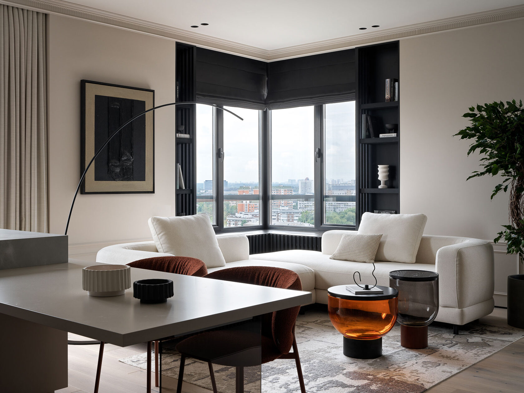 Любовь заказчицы к закатам нашла свое отражение в созданном мной интерьере. Важно было сделать легкое и изысканное пространство с расслабляющей атмосферой, передав при этом характер хозяйки. Концепция интерьера раскрывается в гостиной с угловым окном, которое я выделила цветом. Из него можно наблюдать, как день сменяет ночь, озаряя комнату яркими солнечными красками. Здесь я обустроила место для отдыха и наслаждения напитками, специально убрав спинку дивана, чтобы комфортно любоваться закатами и рассветами.